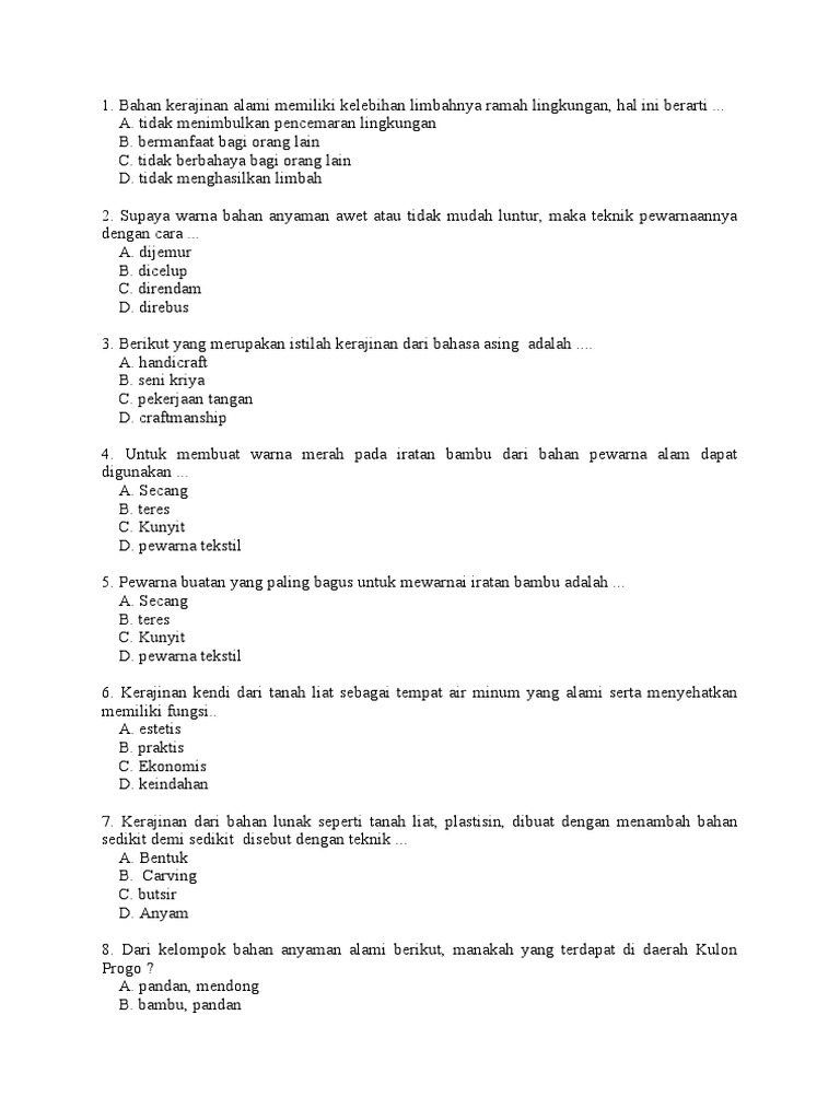 Bahan kerajinan alami memiliki kelebihan limbahnya ramah lingkungan hal. 13Bahan anyaman alami diambil dari lingkungan alam sehingga cocok untuk usaha kecil karena biaya produksi lebih murah tapi memiliki berbagai kekurangan seperti di. Latihan Soal PASUAS Prakarya Kelas 7 Semester 1 SMPMTs Kurikulum 2013.